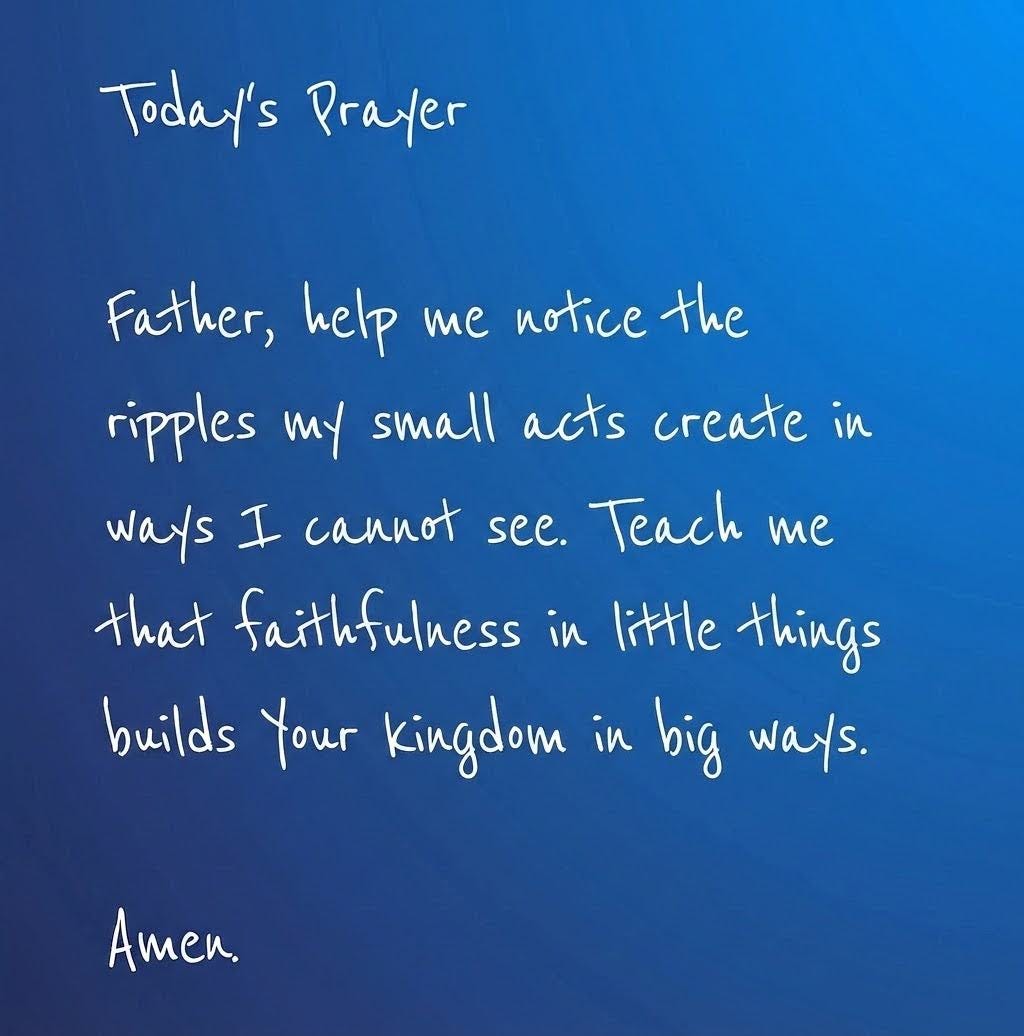 Notice the ripple: Pay attention to how one act changes the next interaction (in you and in them). Small acts, flowing from a willing heart, carry more weight than you know.